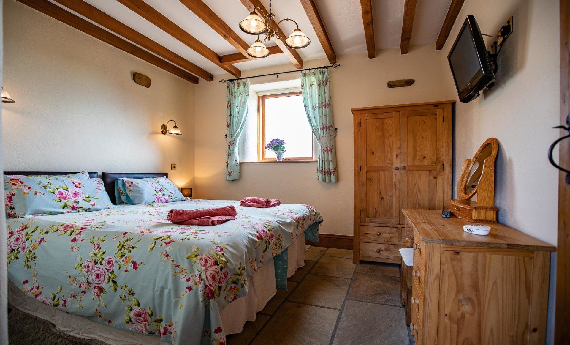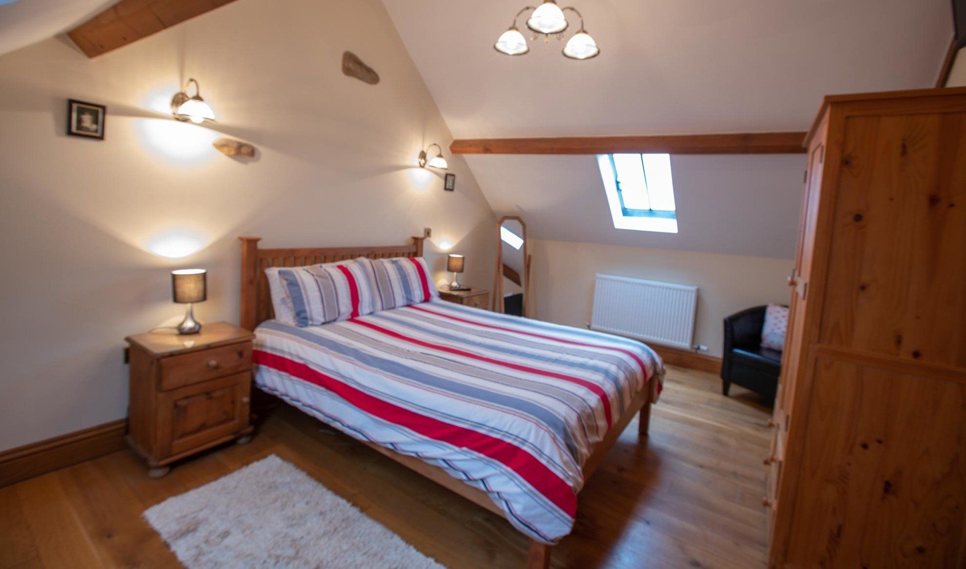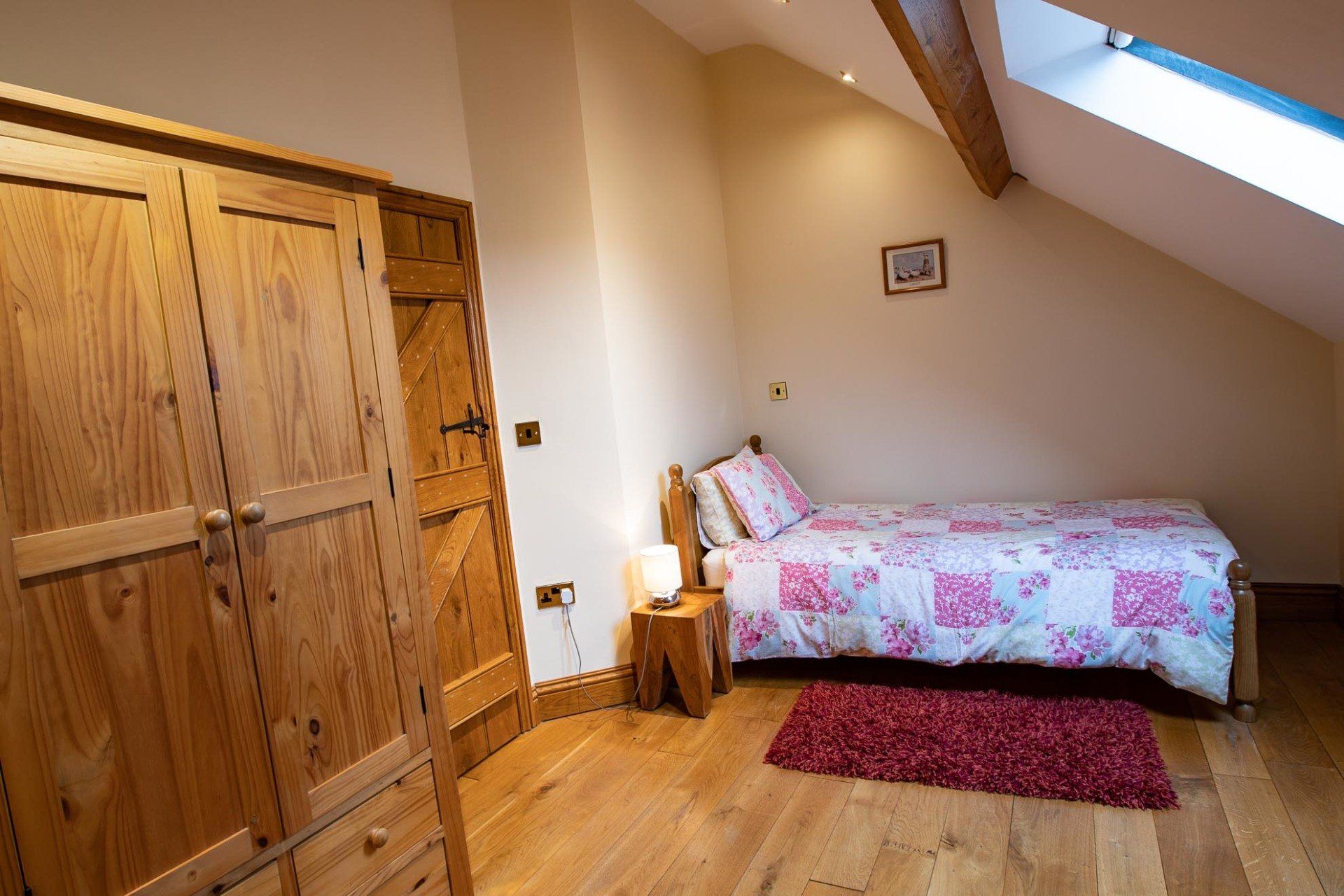 The ground floor with disabled access consists of a double bedroom with a super king-size bed which can be divided into two singles if preferred. Next door is a wet room in which shower chair and grab rails can be added if required.