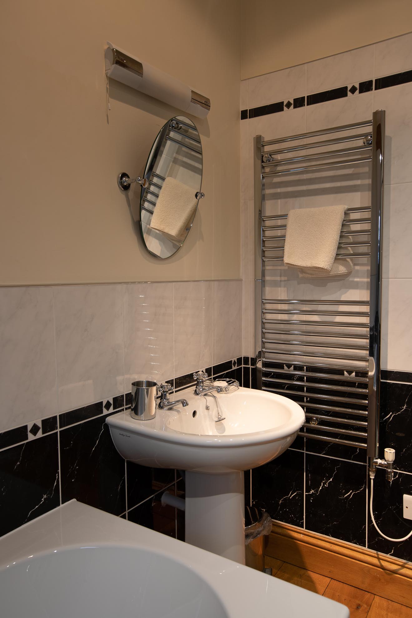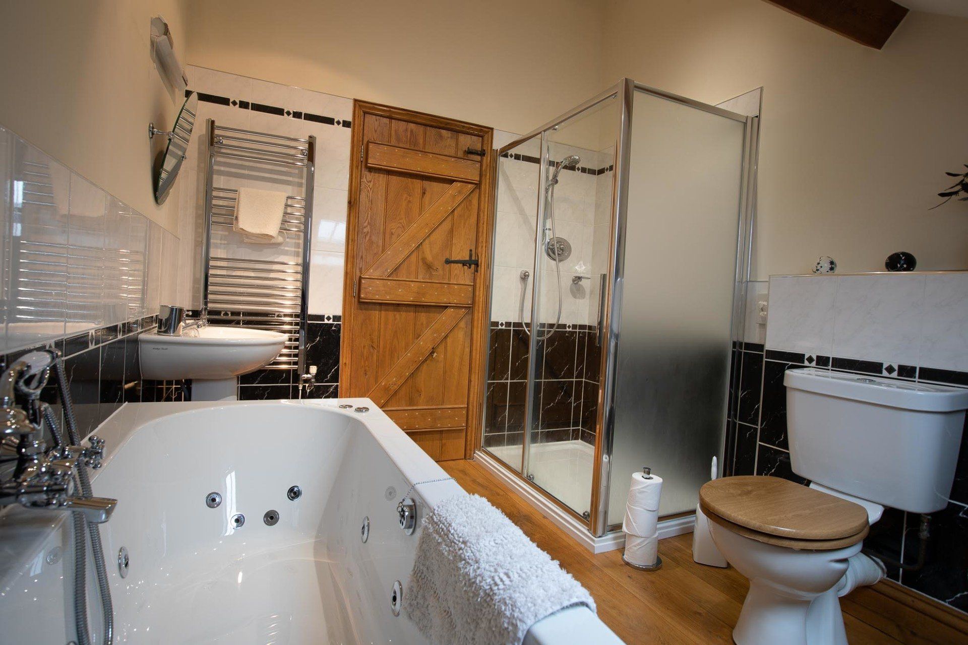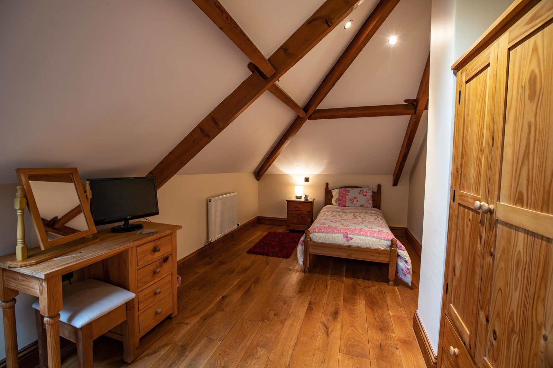 The ground floor with disabled access consists of a double bedroom with a super king-size bed which can be divided into two singles if preferred. Next door is a wet room in which shower chair and grab rails can be added if required.
